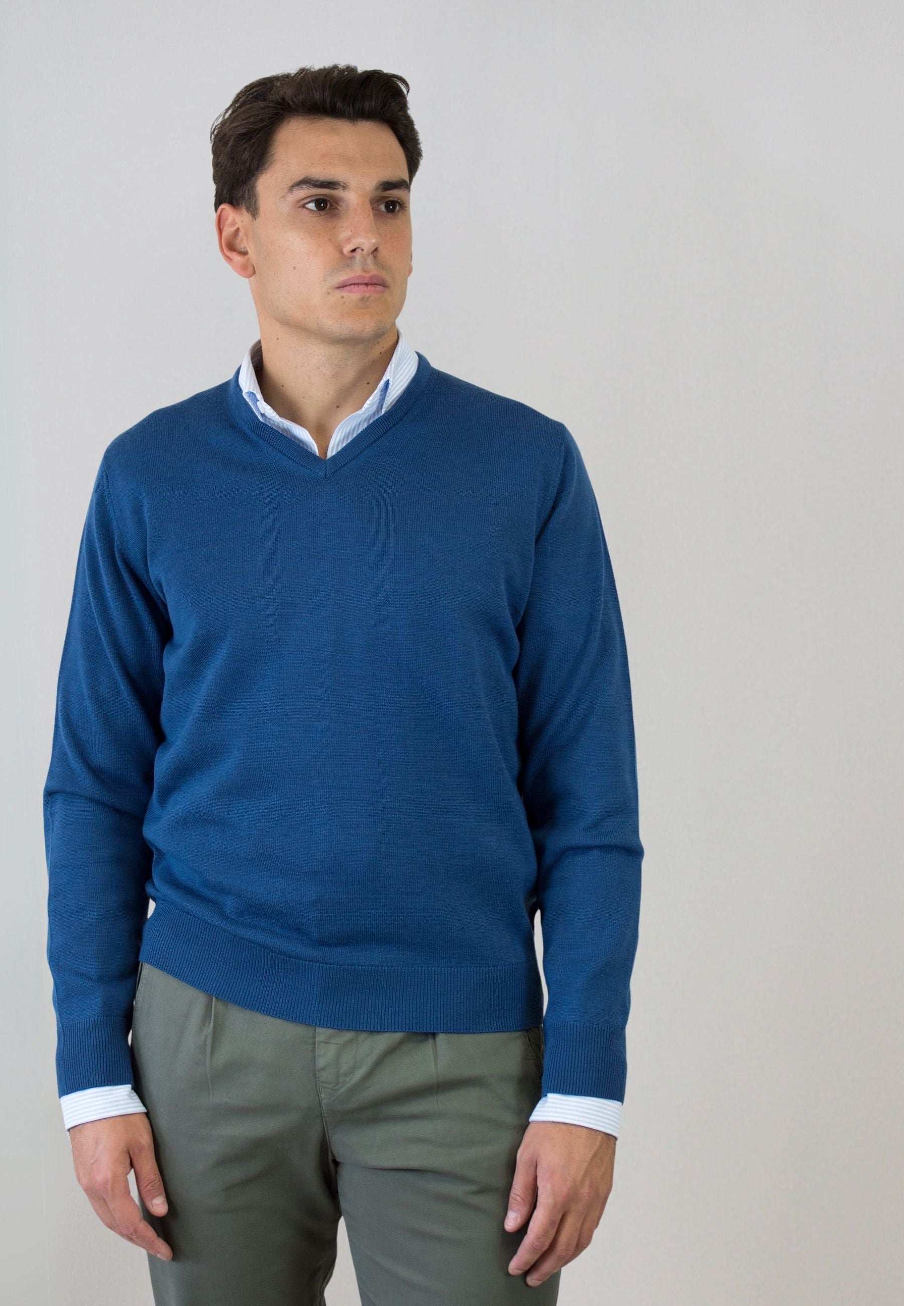 Jersey de pico azul con lana, hecho con mimo en España, concretamente en Logroño. Confeccionado para durar mucho, y sin bolillas.