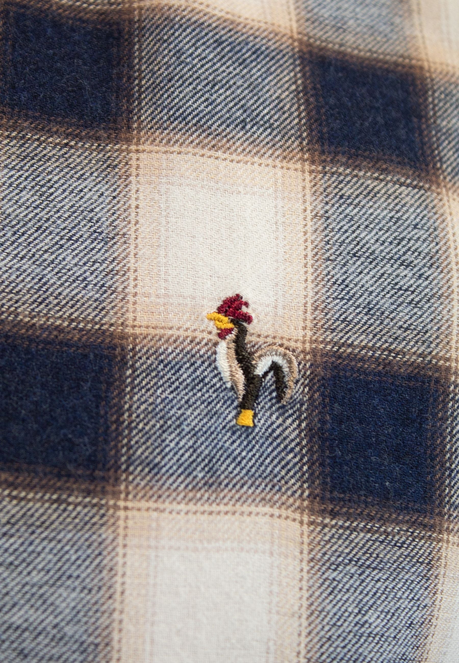 Camisa de cuadros beige y marino. Confeccionada en nuestro PROPIO TALLER, con energía renovable 100%.