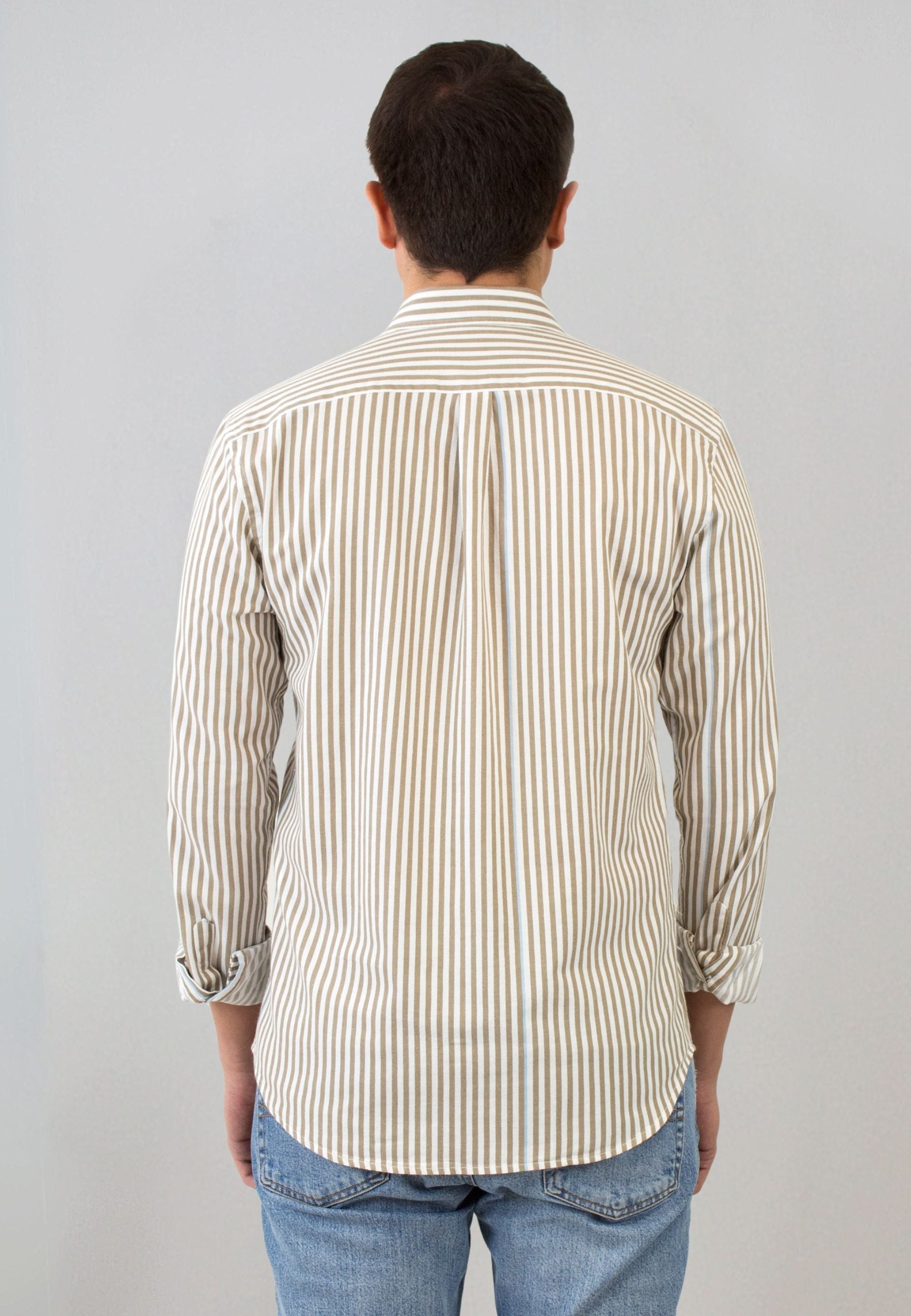 Camisa de rayas tostado con detalle confeccionada en España, en nuestro PROPIO TALLER, con energía renovable 100%.