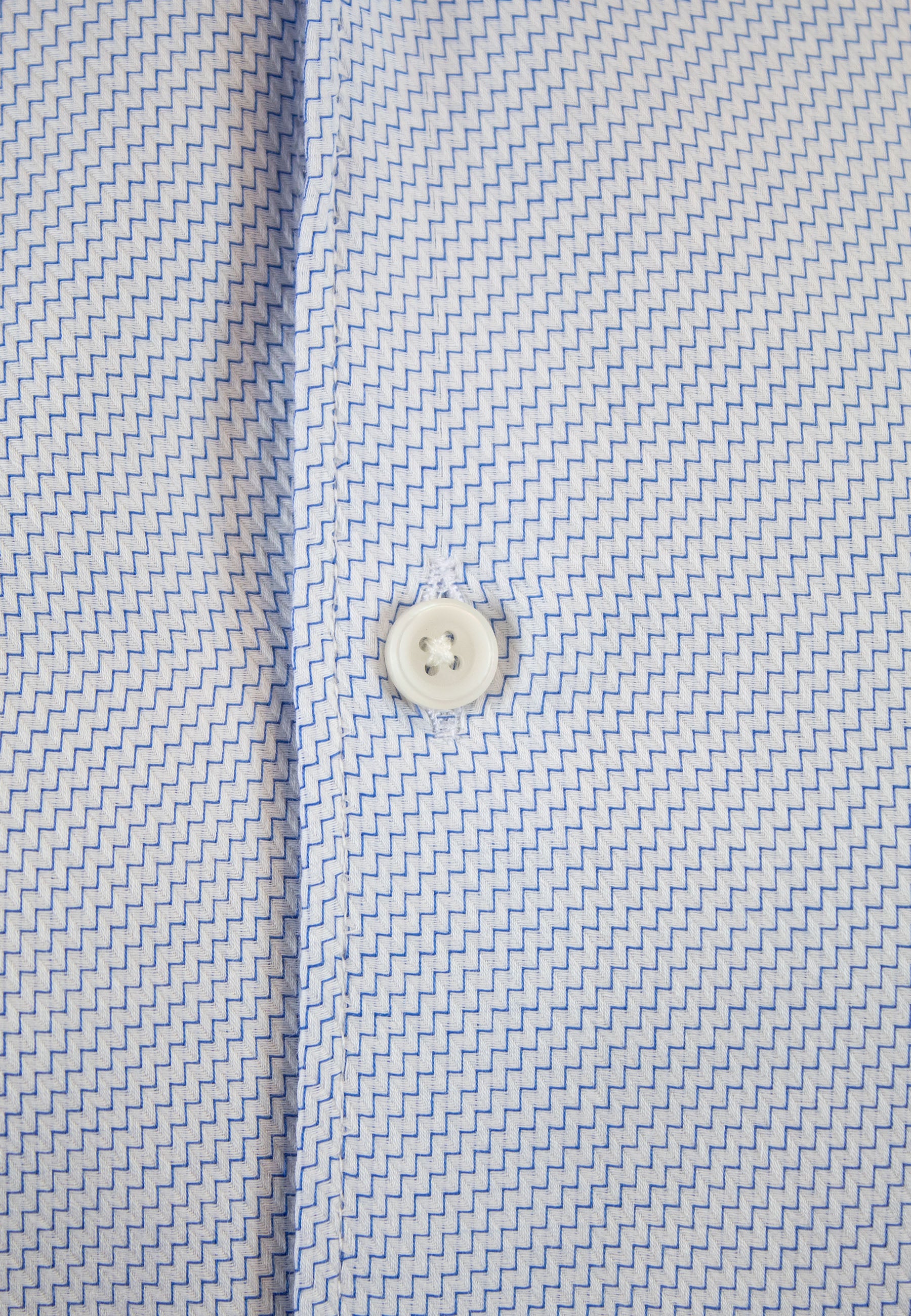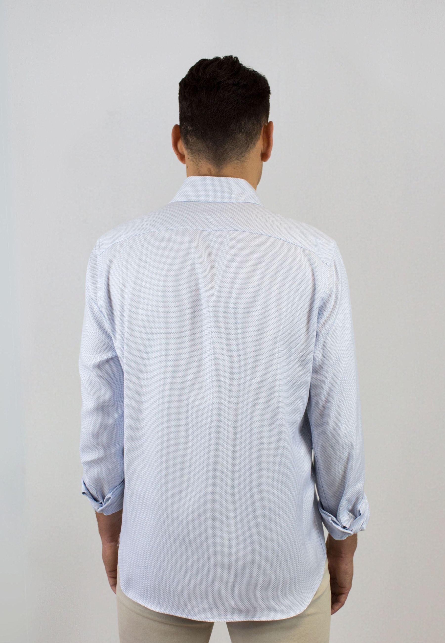 Camisa estructura geométrica blanca y azul confeccionada en tejido 100% algodón, ideal para cualquier ocasión. Además, está confeccionada en nuestro PROPIO TALLER, con energía renovable 100%.