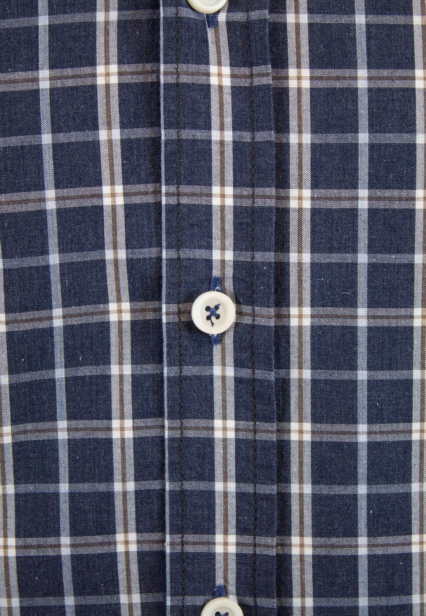 Camisa marino de cuadros blancos confeccionada en tejido 100% algodón, ideal para el otoño-invierno. Además, está confeccionada en nuestro PROPIO TALLER, con energía renovable 100%.