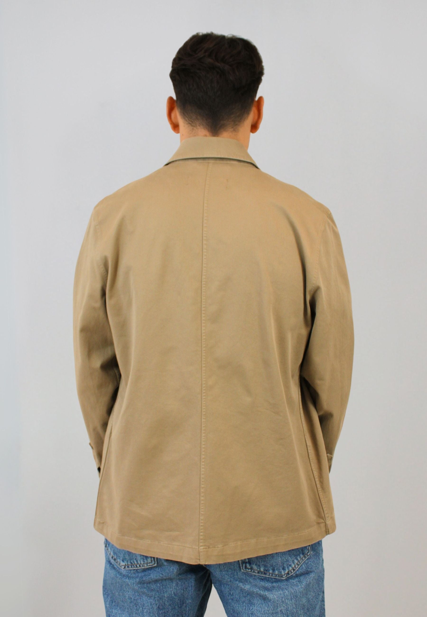 Cuello italiano, sin botón, manga larga, dos bolsillos delanteros y uno a la altura del pecho.
